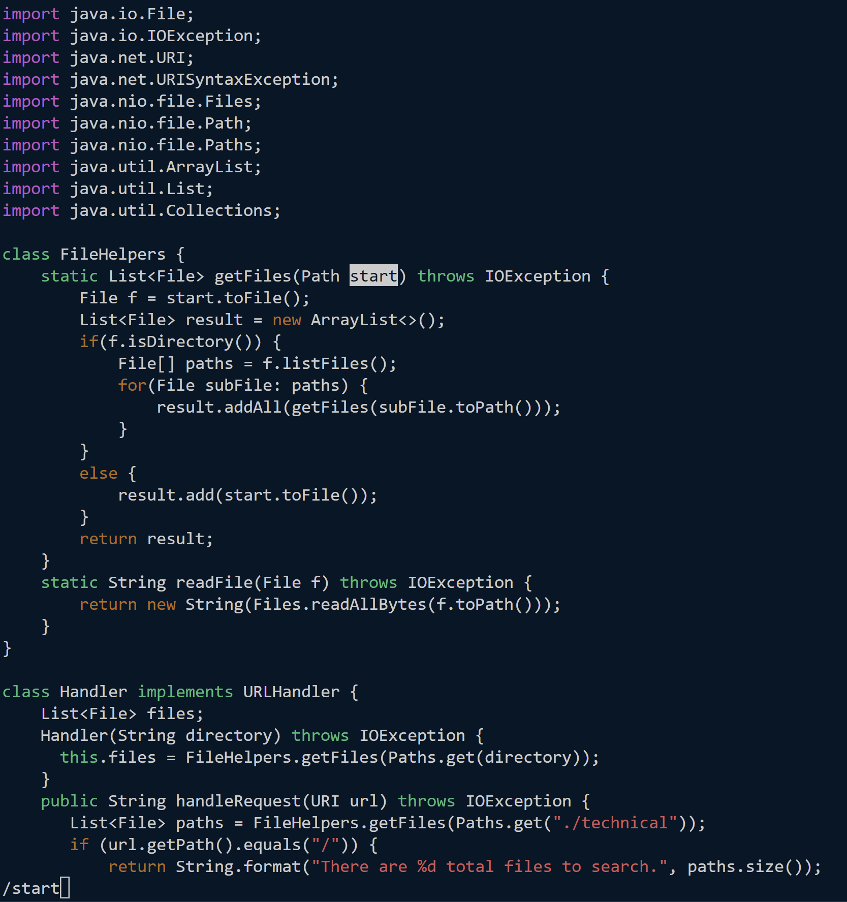 Our first set of keys, /start <enter>, will find all the instances of the word (and therefore the variable) start, allowing us to reach each one with ease. Pressing enter lets our cursor move to this location.